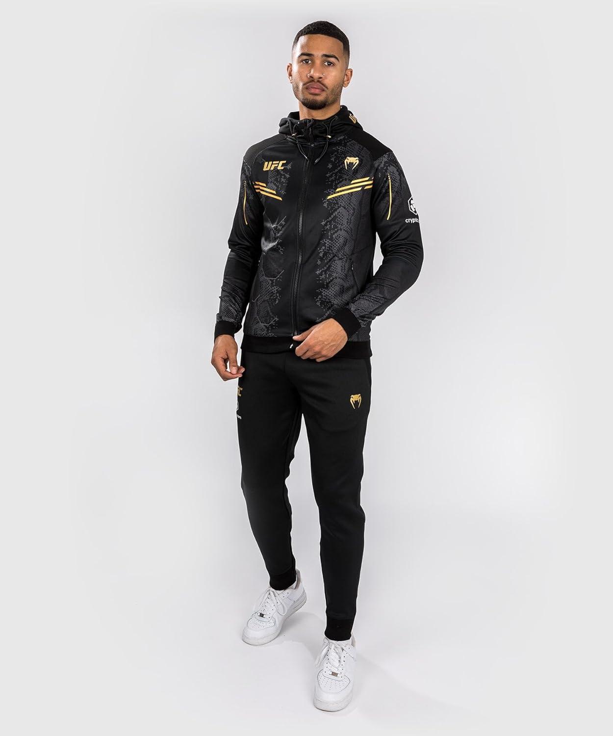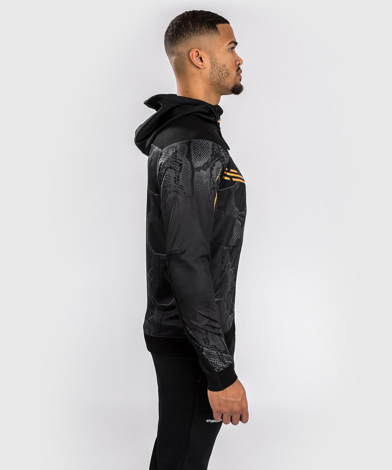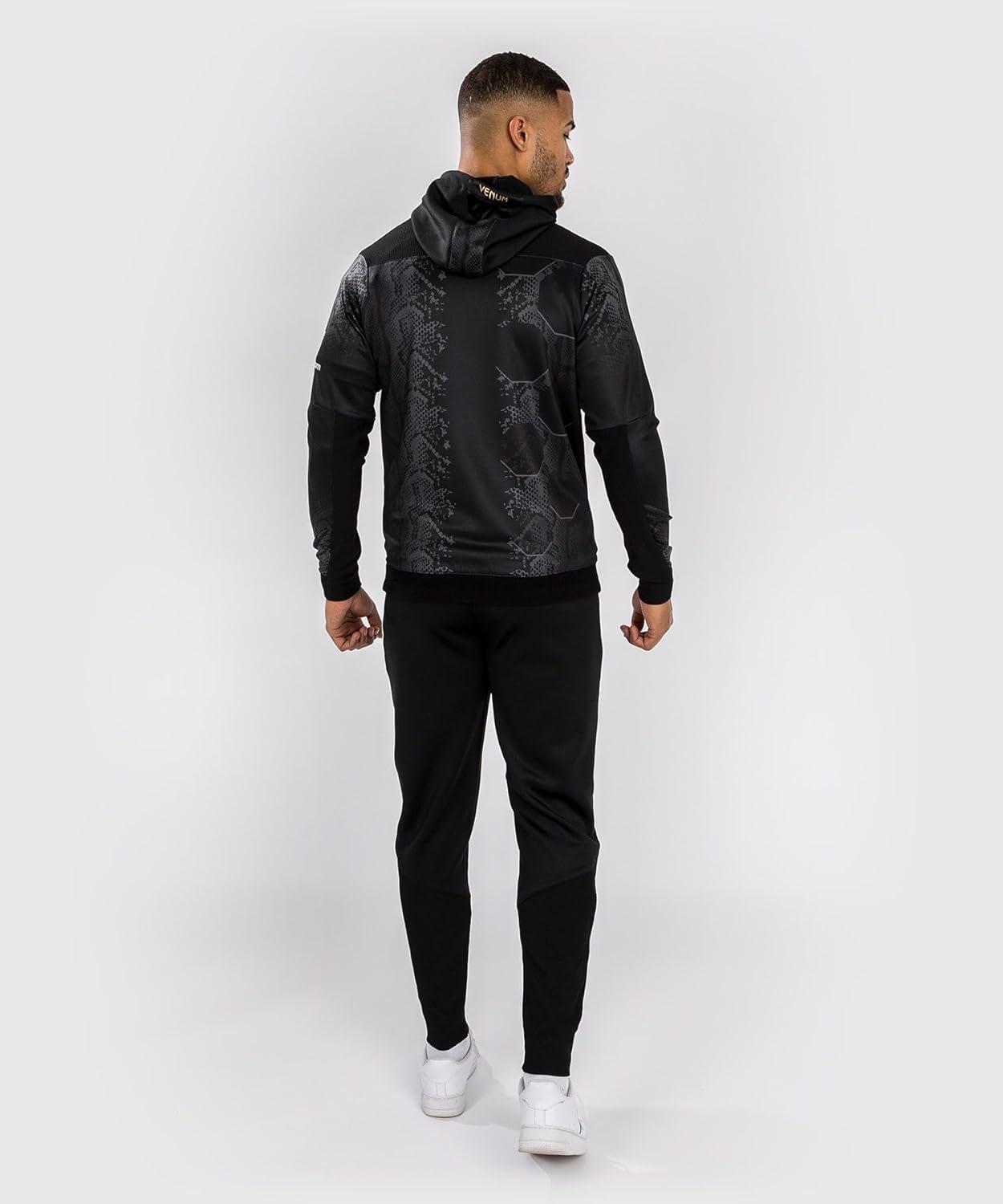 This men’s full zip hoodie is part of the latest high-octane collection from Venum and the UFC. Worn by competing UFC athletes, the UFC Adrenaline by Venum collection is as hardworking as the fighters themselves. The bold design, with sublimated snakeskin graphics and white logo detailing, is a nod to the adrenaline-fueled experience of stepping into the Octagon. The UFC Adrenaline by Venum Authentic Fight Night Men’s Walkout Hoodie features two zipped pockets, plus a mesh-lined hood with adjustable drawstrings. The wrists and inner panel of the arms are made with a premium stretch fabric, to allow fighters to take off their hoodies without taking off their gloves. Available in two colors, it matches perfectly with the other products from the same collection.