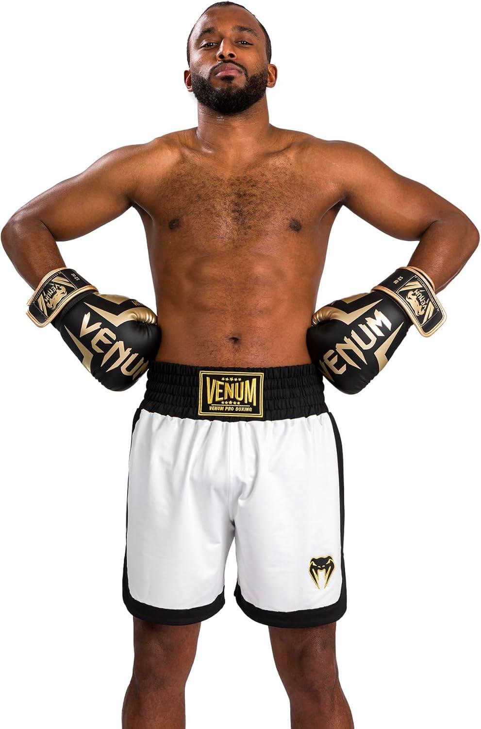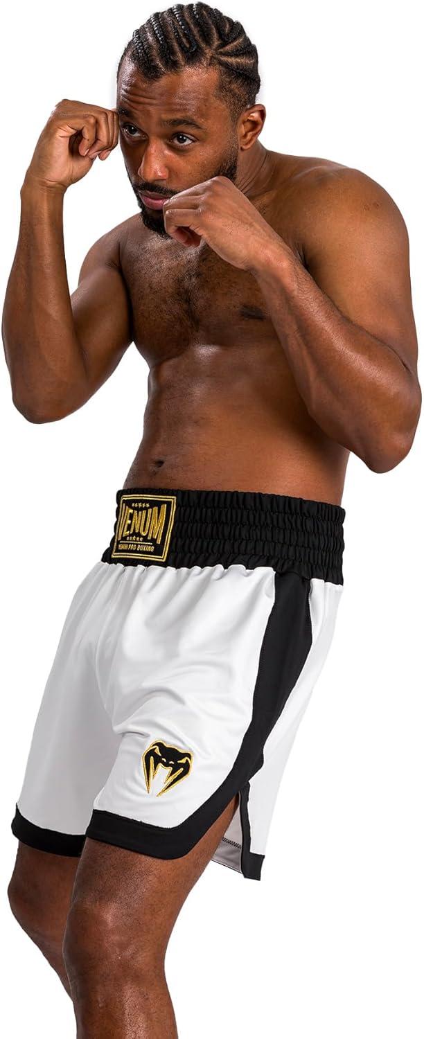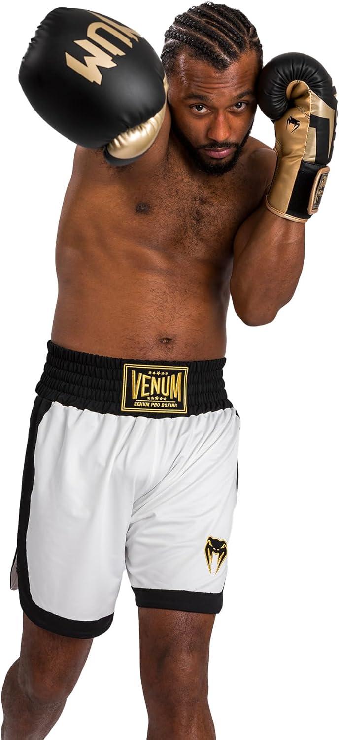 A Venum twist on the traditional, Venum Classic Boxing Shorts are designed for athletes and practitioners of the Sweet Science. These lightweight boxing shorts feature a traditional wide waistband for a secure fit, so you can focus on your performance in the ring. Meanwhile, flexible fabric and side slits facilitate full range of mobility. Duck and weave in comfort with these loose-fit breathable shorts, designed for your comfort.Embroidered Venum logos feature in gold at the front and back of the waistband and the left thigh.Pair these boxing shorts with your favorite Venum pro gloves for a complete look during sparring and competition.